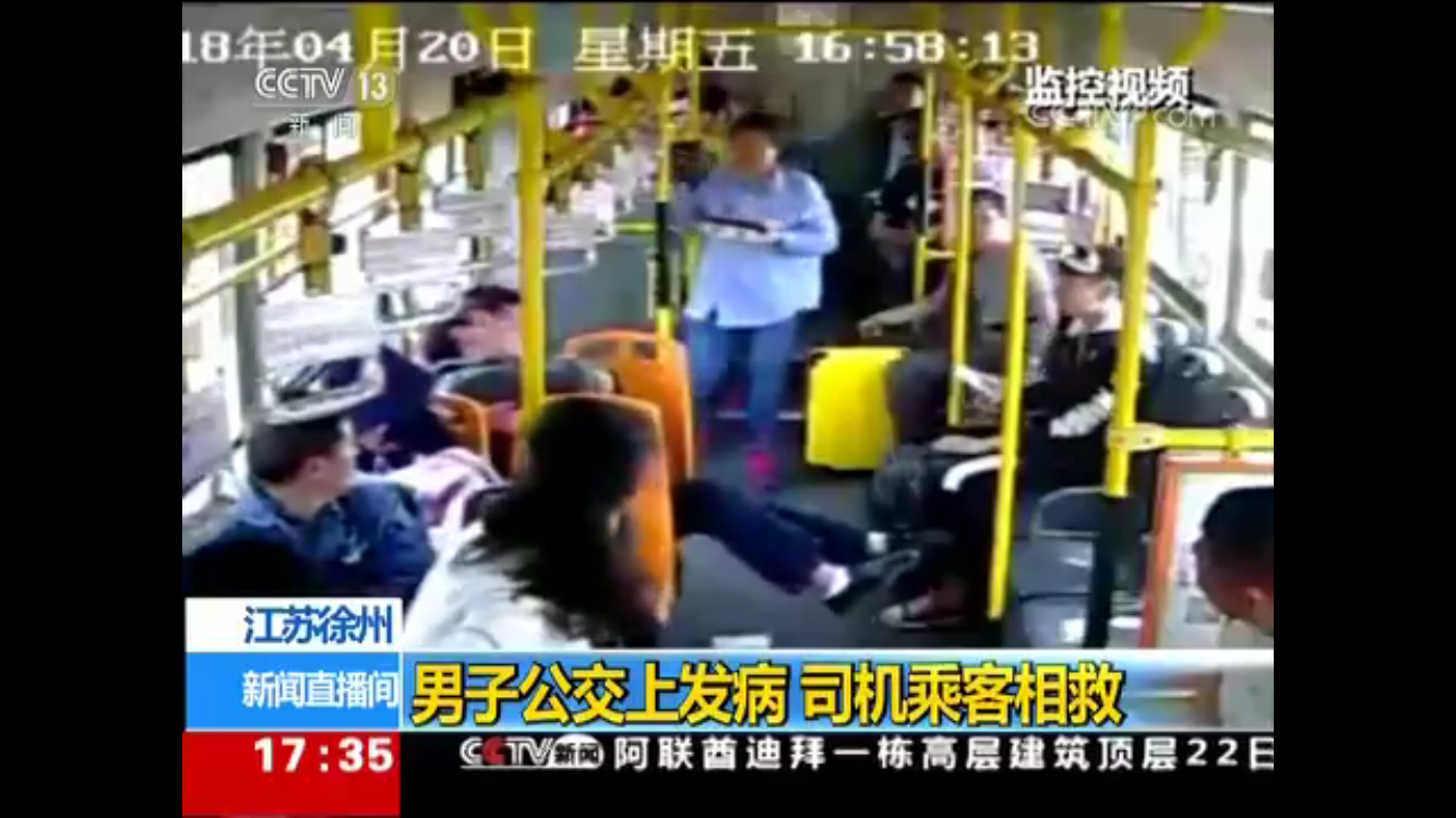 4月20日下午4點(diǎn)58分,26路自編號5025車從徐州開往賈汪途中,一名坐在車中間座位上的男乘客突然倒在了旁邊乘客身上,口吐白沫,渾身抽搐打著哆嗦,情況十分危急。乘務(wù)員昝昱安和周圍乘客立即上前查看,駕駛員耿德志也急忙停下車趕來。