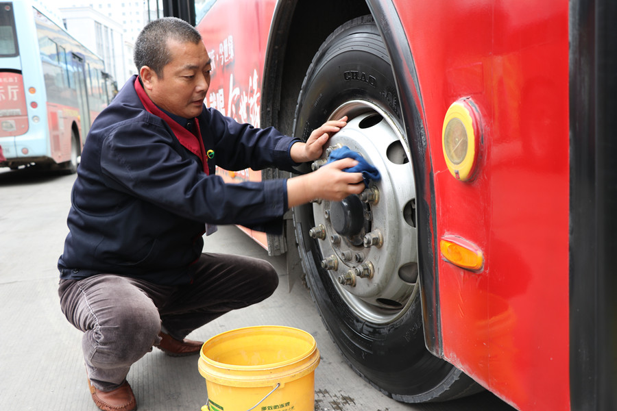 85路線經(jīng)過礦區(qū)路況差,一趟車下來車就很臟了,黨員祁保華把勞動當(dāng)成一種樂趣,只要車輛停下來,他就會拿起刷子,把車身從前到后刷上一遍,再用抹布細細擦,輪胎更是一趟一擦,一天8個來回,他就要擦8遍輪胎。晚上在文化宮跑夜班,都晚上9點了,他還借著微弱的路燈,里里外外把車打掃干凈。在他的帶動下,85路線駕駛員由觀望到比賽,都成了車輛保潔的好手。