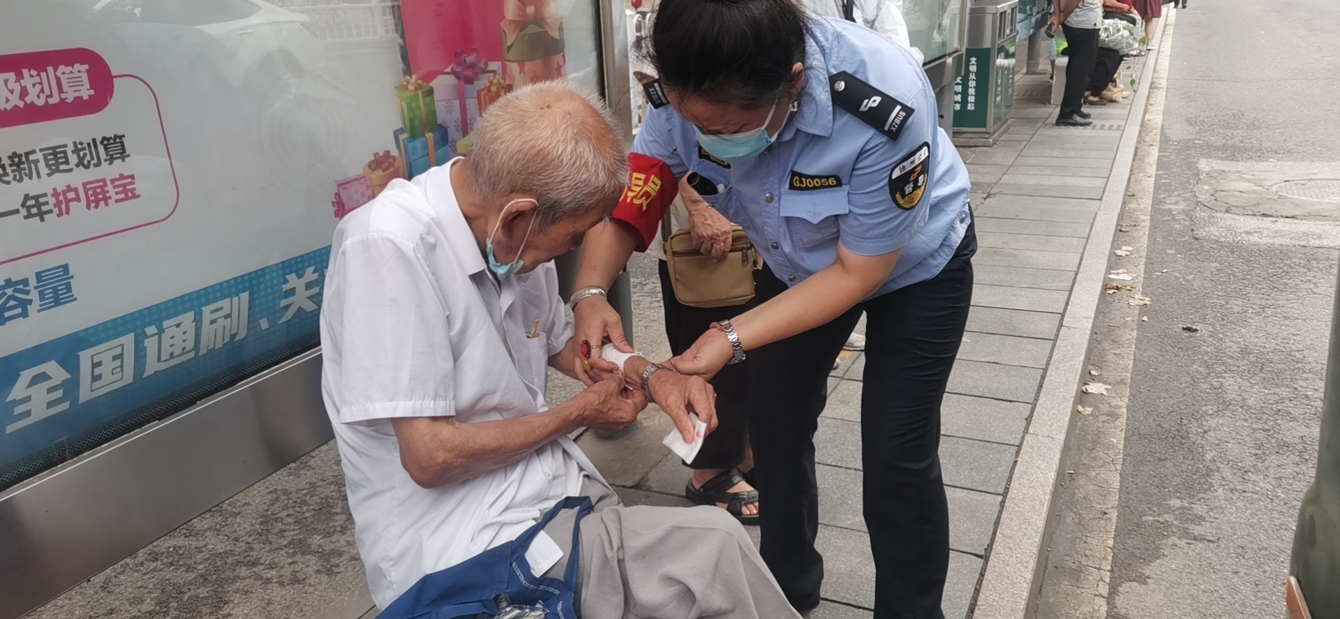 8月2日上午8時(shí)許,公交督導(dǎo)員孫琪在朝陽(yáng)站開(kāi)展站臺(tái)執(zhí)勤工作時(shí),突然聽(tīng)到有人大喊:“快來(lái)救一下,有人摔倒了!”孫琪當(dāng)即上前查看情況,發(fā)現(xiàn)一位老人癱坐在站臺(tái)上,不停地喘著粗氣,胳膊上有一個(gè)大傷口,鮮血直流。