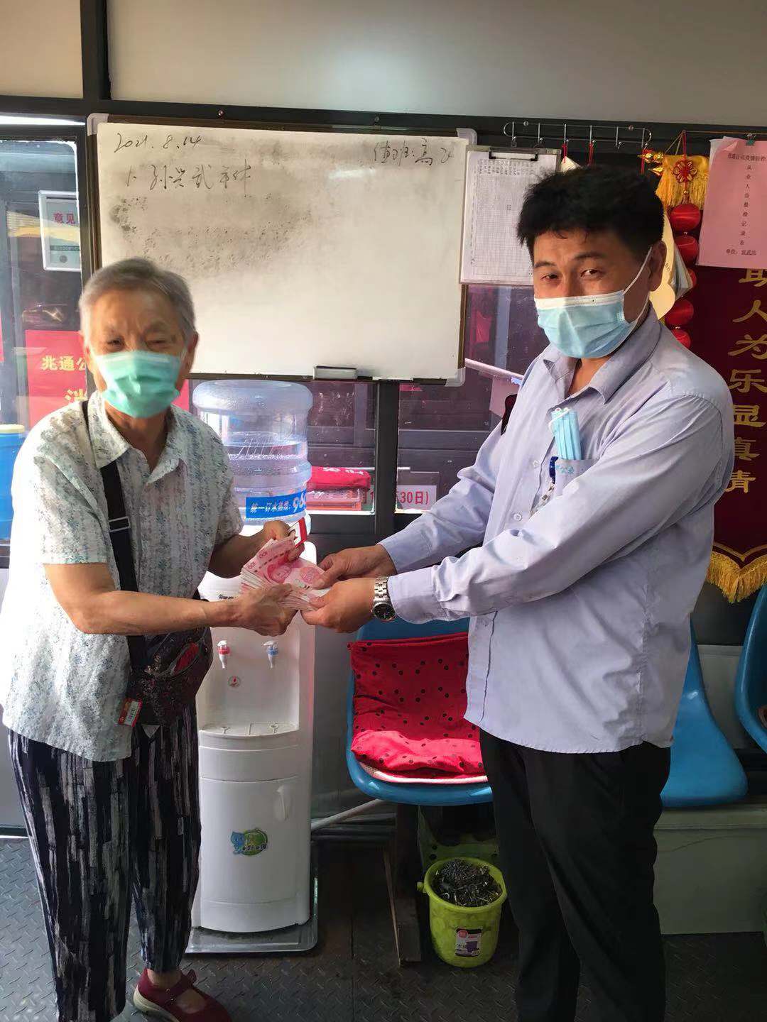 814日上午,段世望像往常一樣駕駛618294號(hào)車從徐村開往宣武市場(chǎng),在宣武市場(chǎng)車站打掃衛(wèi)生時(shí),在座位下發(fā)現(xiàn)一個(gè)錢包,段師傅立即將包交到車站值班室,包內(nèi)裝有身份證及四千余元現(xiàn)金。此時(shí),段師傅正準(zhǔn)備返回車廂做出車前準(zhǔn)備,迎面碰到了心急如焚尋找失物的老人。